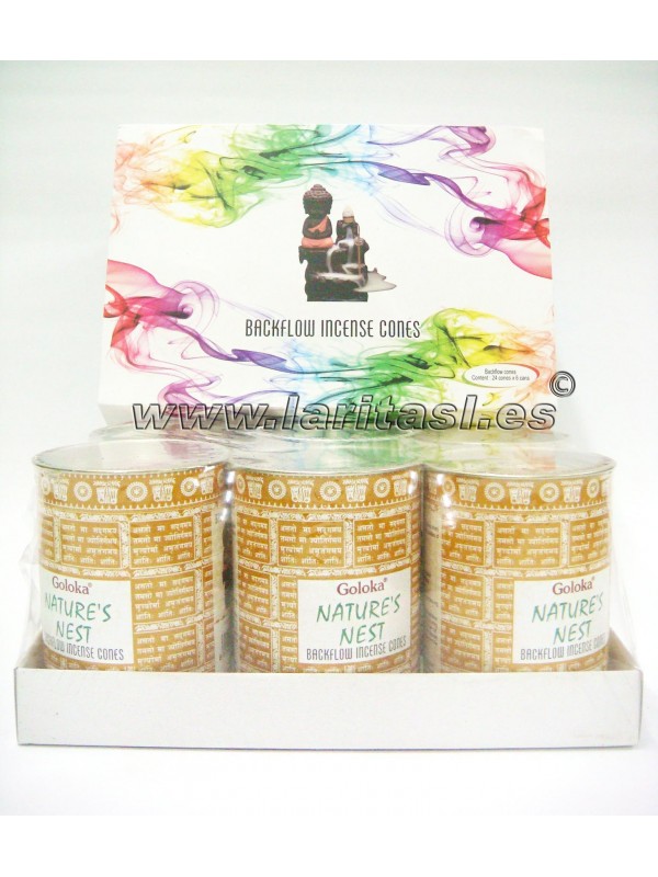 Incenso cones refluxo da fábrica Goloka. Tem a mesma fragância que os incensos em formato de stick Golka Nature´s Nest. Apresentam-se em lata com 18 cones. A duração aproximada é de 20 min.